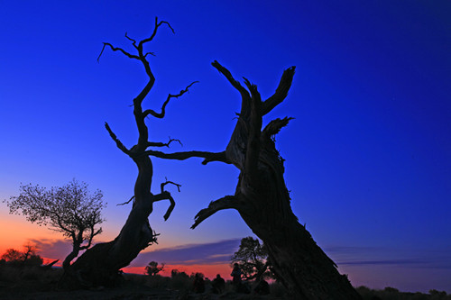 在荒漠漫漫的舞台上,前世一千年的等待,今生一千年的伫立,倒下后一千年的寂寞来生,它将自己用三千年的时间站立成一道独特的风景,成为地球上生命的不死精灵。生生死死三千年,它是有灵性的,在每一个漫长的冬季里,在生命漫长的季节里,该有多少风风雨雨?一棵树竟有三千年的时间来思考生命的问题,它一定明白在生命低洼的季节里,耐心等待,默默积蓄着力量,等待春天的绿色,盼望秋天的灿烂,灿烂的季节里它也一定知道生命的短暂,凝重的金色里透露着苍凉,古朴的庄重里弥漫着悲壮。似相恋的情人两两相望,似盼望的伊人在水一方望眼欲穿、望穿秋水,似一双双走过风雨人生经历千百年沧桑的老人千年搀扶、相濡已沫,似奔向人生光明走向希望大鹏展翅,似忠诚和忠贞千年守望,似哺育和呵护的母亲慈母背子。