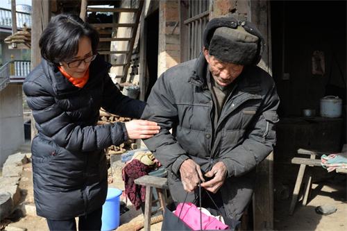 邵瑛一行给王本仲老人家,再次送上衣服和慰问金。王老一家目前生活依然困难。邵瑛翻翻他家薄薄的被子,摸摸漏风的窗户,难过得掉眼泪。她和盟市委机关干部和扶贫队工作人员商量,2018年重点帮扶王老家。