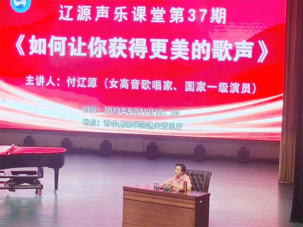 9月21日上午,民盟湖南省委会常委、国家一级演员、女高音歌唱家、湖南省音乐家协会副主席、湖南民盟艺术团团长付辽源应邀来到湖南人文科技学院,为该院音乐舞蹈学院声乐教研室的师生们做“辽源声乐课堂第37期——《如何让你获得更美的歌声》”学术讲座。